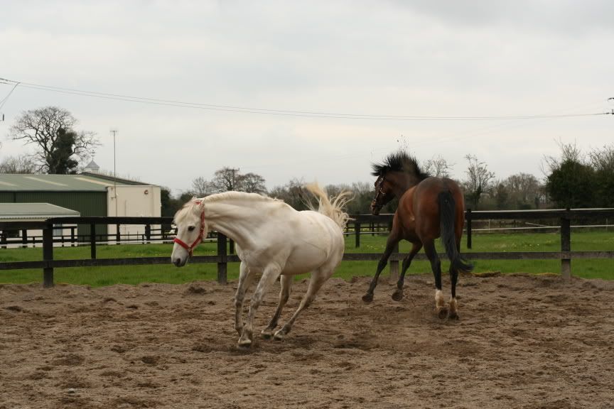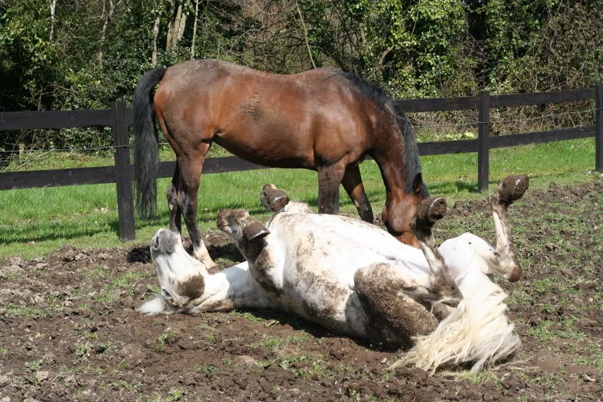 Here's a couple of pictures taken yesterday and today of Spirit [the white horse] and his girlfriend Rogue [the chestnut mare] in the field and Nipper the Blacksmiths dog. And one of Ruby and her owner backlit in the barn. C & C welcome. All taken with a Canon EOS 350D with a 50mm f1.8 with aperture priorty. The weather in Ireland has been super for the last 2 days.