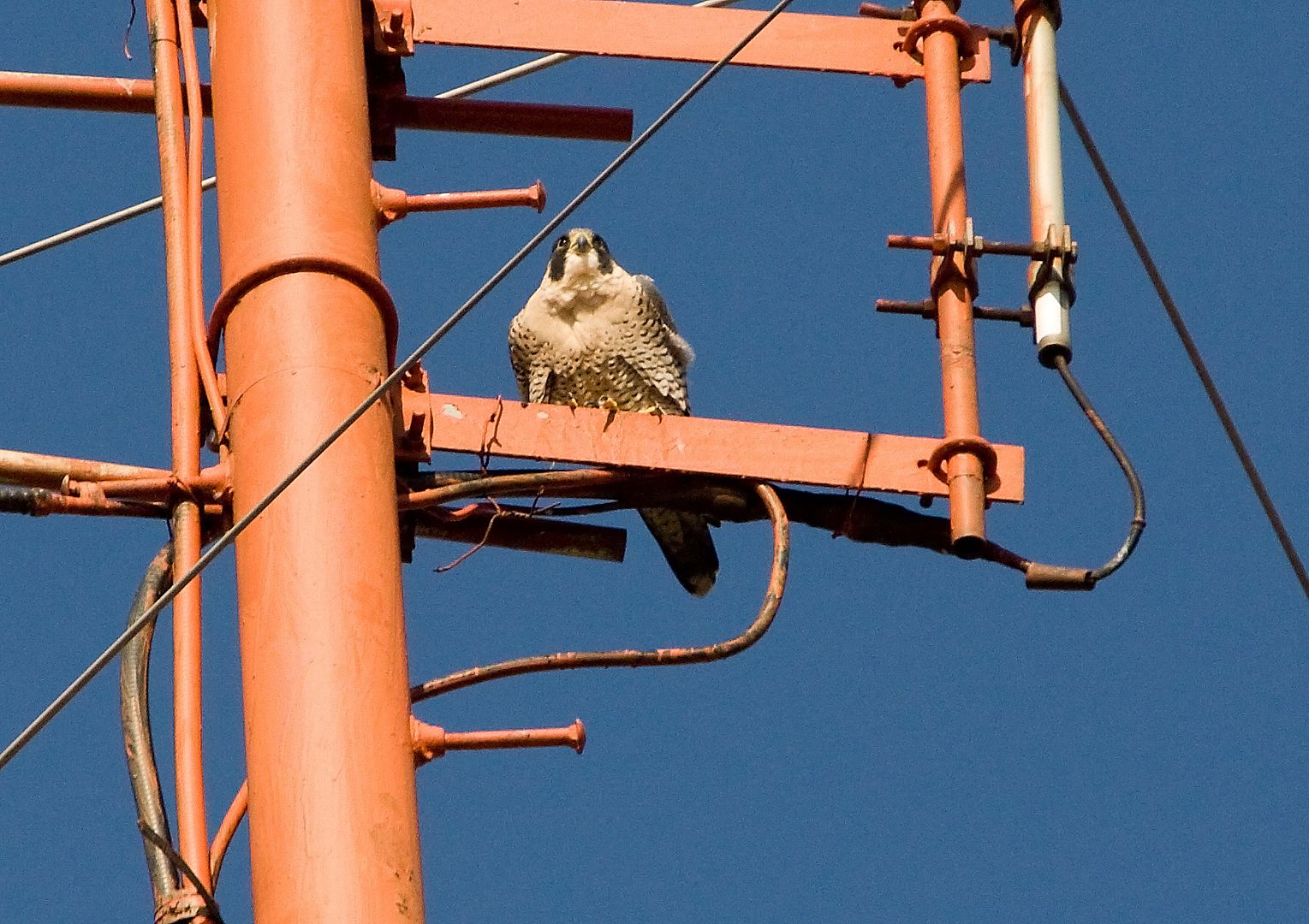 About an hour before my shift at work ended. A co-worker called me outside to this bird sitting on our radio antenna. When I got outside and looked up all I saw was this massive bird on the antenna. I assembled my 40D with the sigma 70-200 with 2x and took some shots.